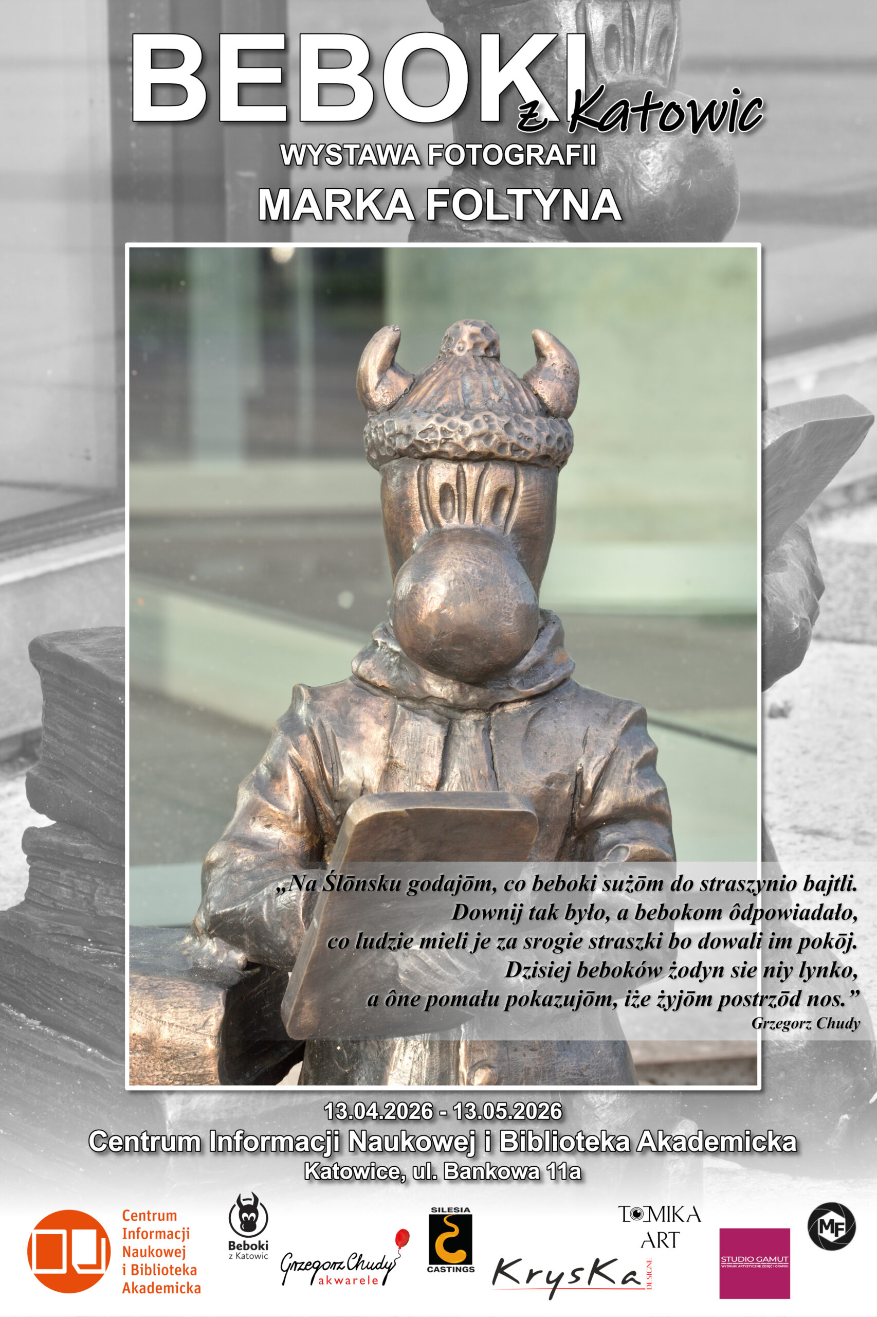 Miło nam poinformować, że od 13 kwietnia w CINiB-ie będzie można oglądać wystawę fotografii Marka Foltyna zatytyłowaną “Beboki z Katowic”. Beboki to projekt Grzegorza Chudego, artysty z katowickiego Nikiszowca. Szlak beboków został zapoczątkowany w 2021 r. i od tego czasu zyskuje coraz większą popularność!