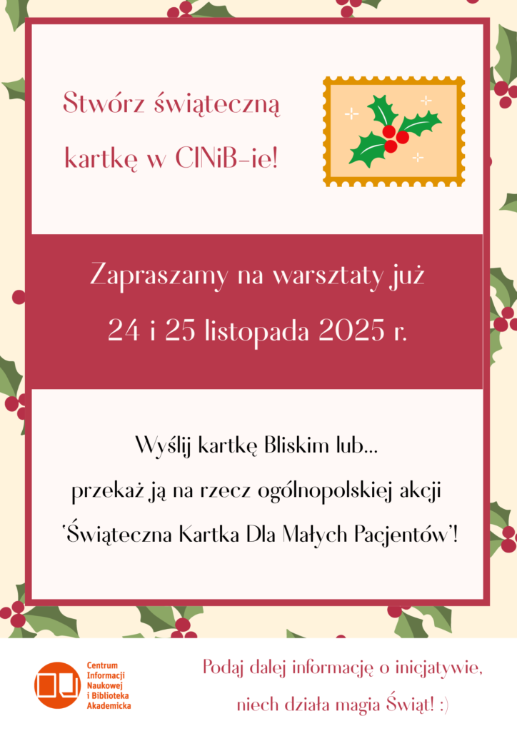 W holu głównym CINiB-y (24 listopada – 12 grudnia 2025 r.) pojawi się specjalnie przygotowana stacja ze świątecznymi materiałami plastycznymi. Codziennie w godzinach pracy biblioteki będzie można przy niej stworzyć indywidualnie kartkę na rzecz prowadzonej akcji. Gotowe prace z wypisanymi życzeniami (wykonane przy stacji lub w czasie warsztatów) należy zamieścić w oznakowanej skrzynce. Pracownicy CINiB-y przekażą je bezpośrednio na dziecięce oddziały onkologii i psychiatrii w śląskich szpitalach.